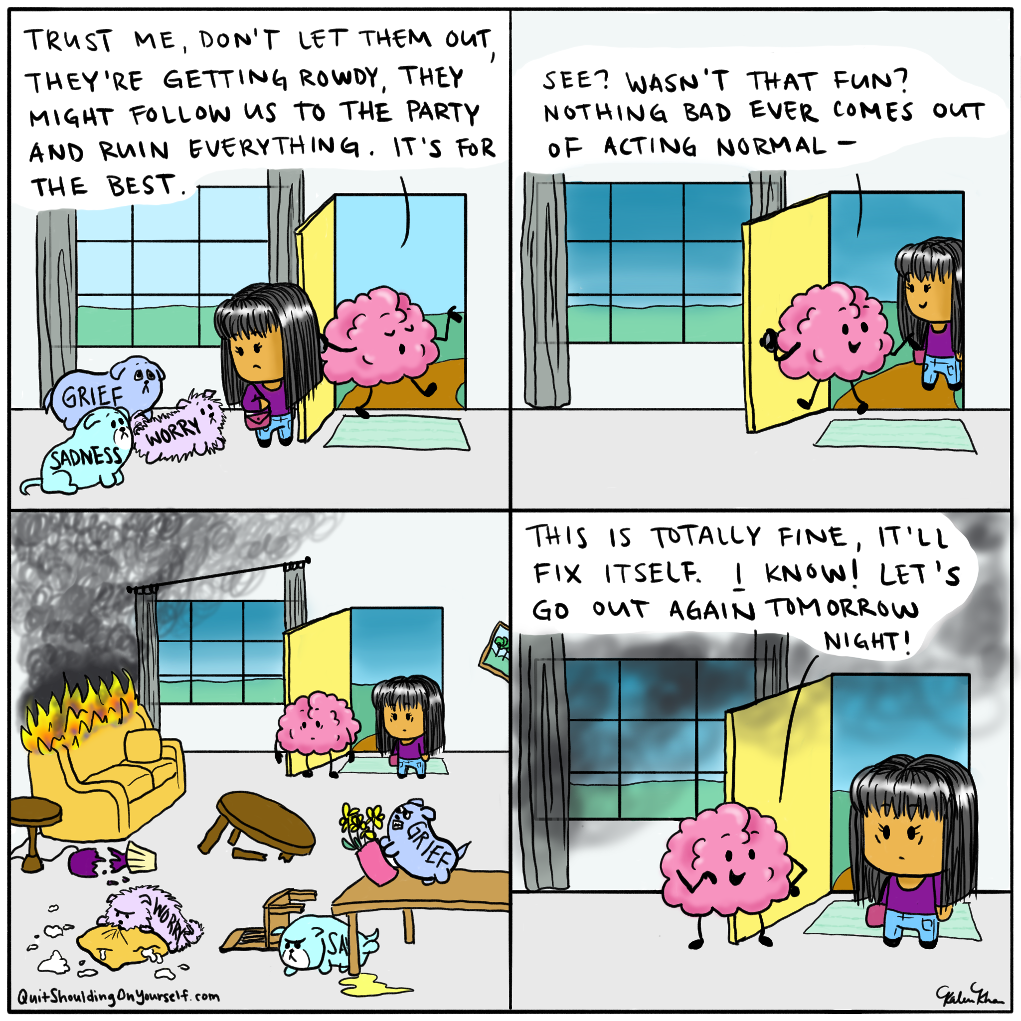 What strategies are you using to keep it together while you struggle with unpleasant emotions? Is there room for having more compassion for yourself, and nurturing for your emotions? Remember that self compassion includes compassion for emotions, even when they’re being a pain in the butt.